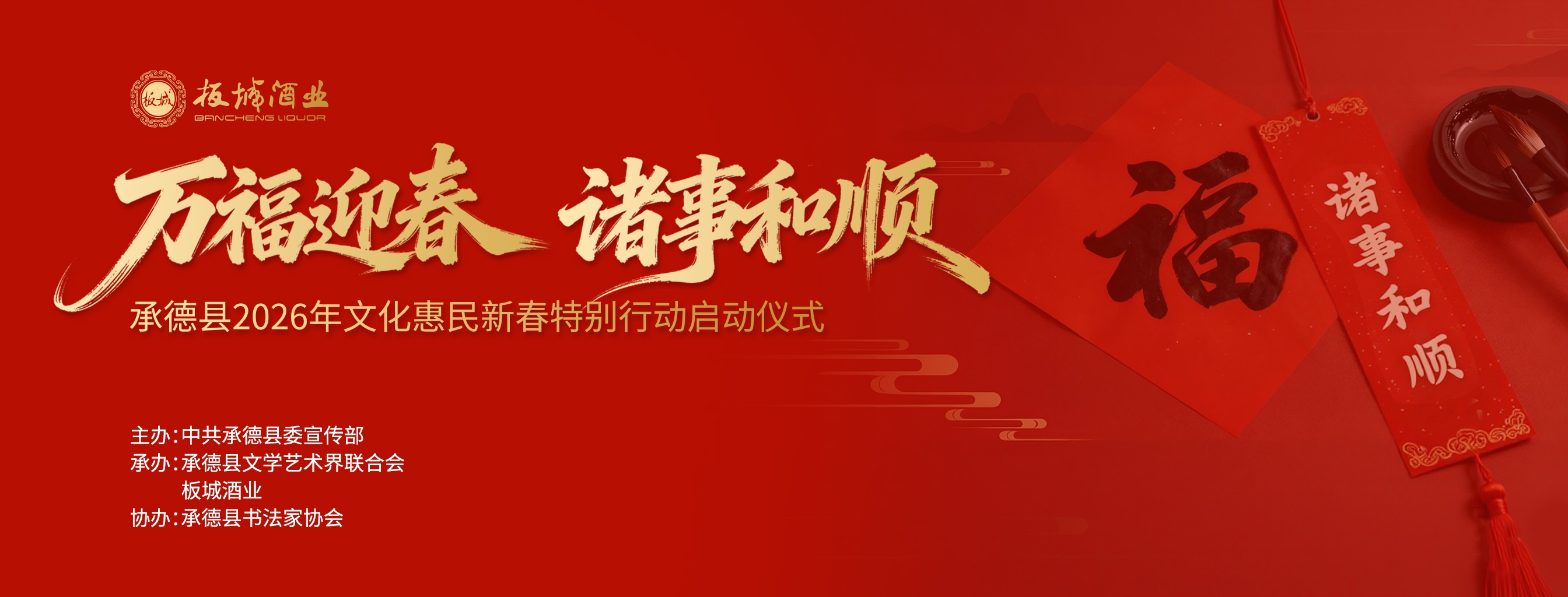 乙巳辭舊歲,丙午啟新程。1月16日,由中共承德縣委宣傳部主辦,承德縣文學(xué)藝術(shù)界聯(lián)合會、板城酒業(yè)承辦,承德縣書法家協(xié)會協(xié)辦的“萬福迎春·諸事和順——承德縣2026年文化惠民新春特別行動啟動儀式”在板城酒業(yè)圓滿舉辦!